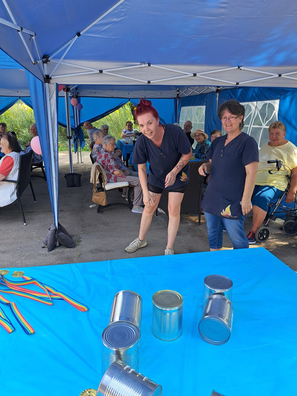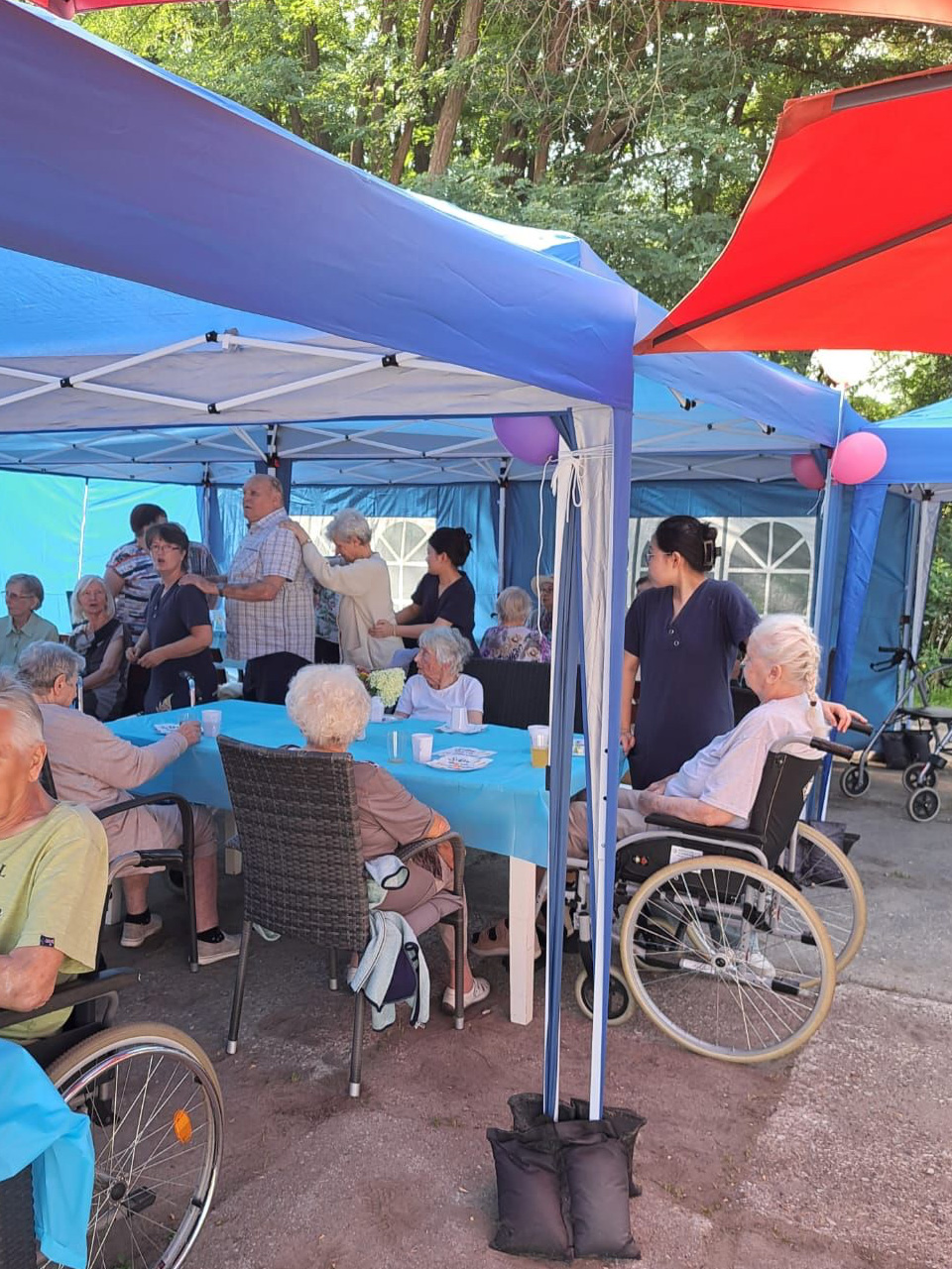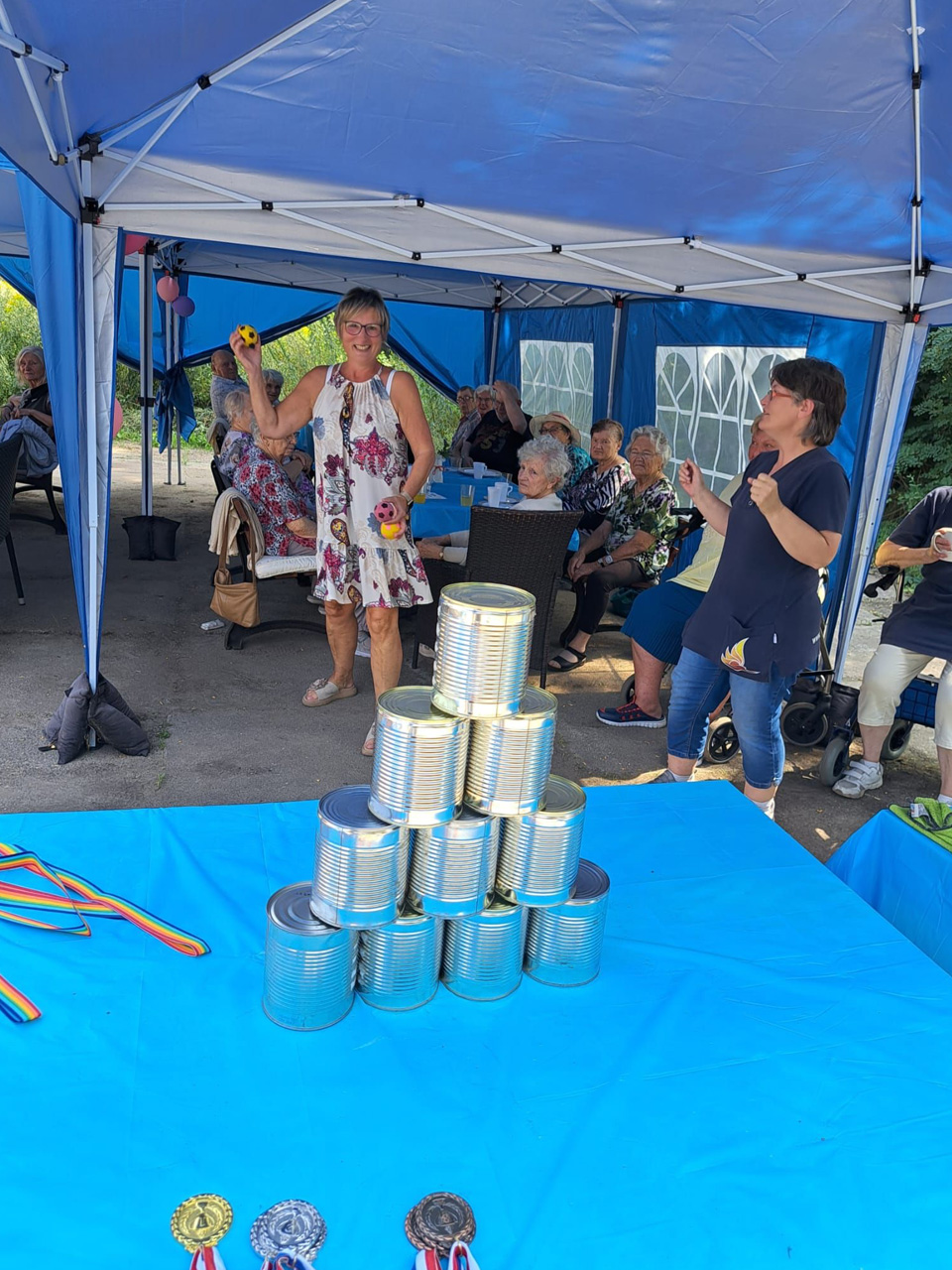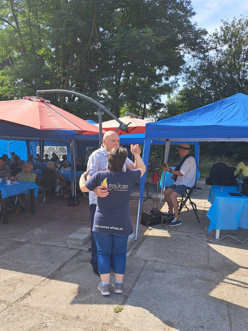 Für Unterhaltung war bestens gesorgt: Beim Dosenwerfen hatten alle großen Spaß – Gäste, Mitarbeiterinnen und unsere Chefin Ines Stoye-Angerstein machten begeistert mit. Außerdem begleitete ein Musiker mit seiner Gitarre das Sommerfest der Tagespflege, und es wurde viel getanzt. Von schwungvollen Tanzeinlagen bis hin zu einer fröhlichen Polonaise – die gute Stimmung war überall spürbar.