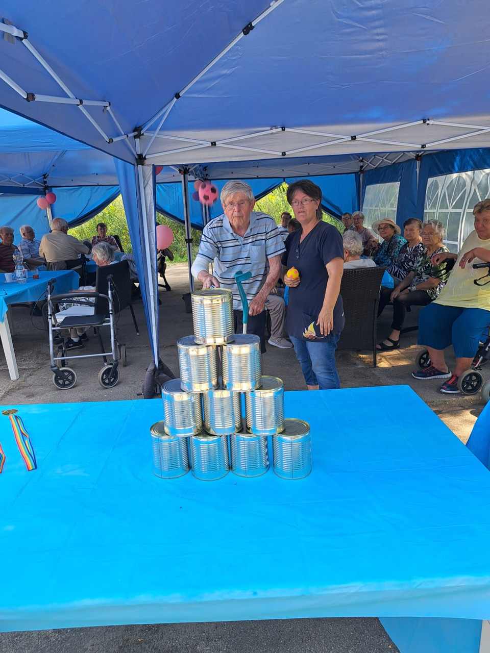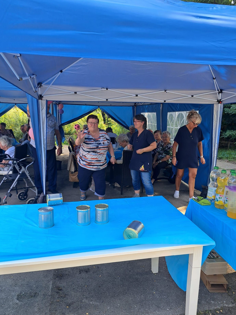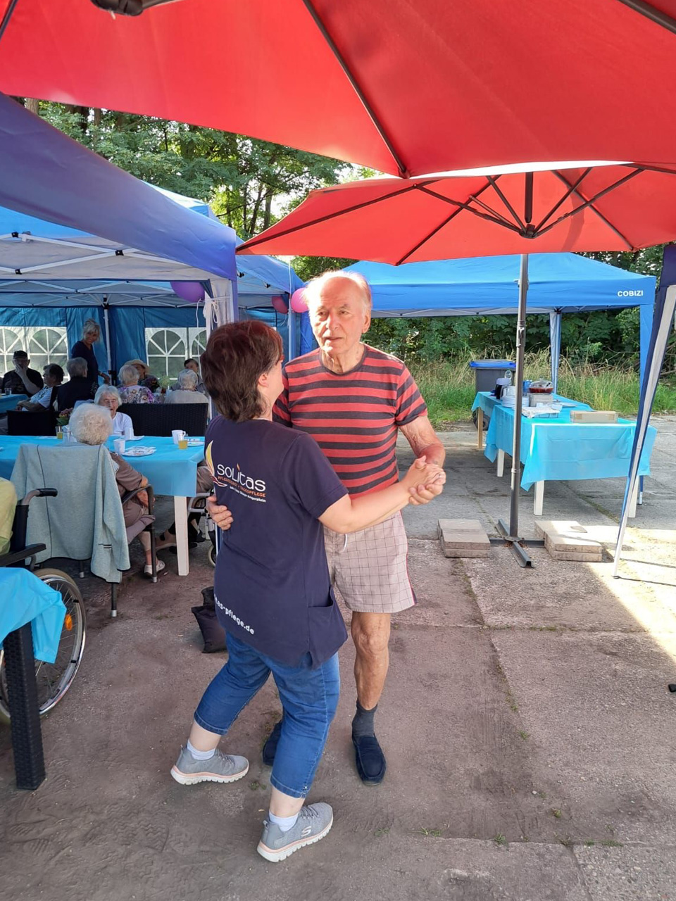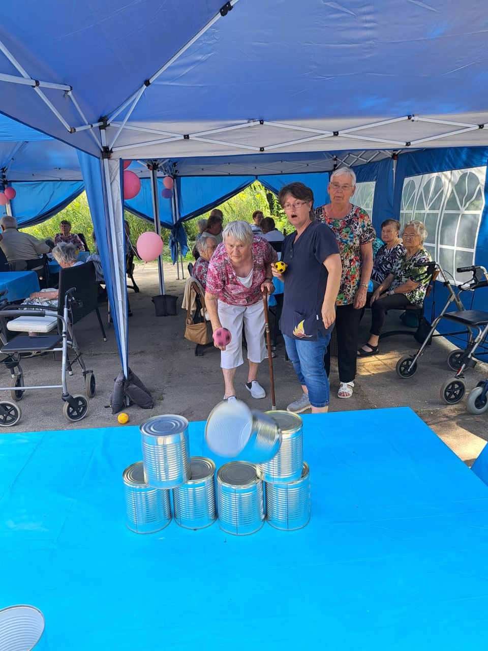 Für Unterhaltung war bestens gesorgt: Beim Dosenwerfen hatten alle großen Spaß – Gäste, Mitarbeiterinnen und unsere Chefin Ines Stoye-Angerstein machten begeistert mit. Außerdem begleitete ein Musiker mit seiner Gitarre das Sommerfest der Tagespflege, und es wurde viel getanzt. Von schwungvollen Tanzeinlagen bis hin zu einer fröhlichen Polonaise – die gute Stimmung war überall spürbar.